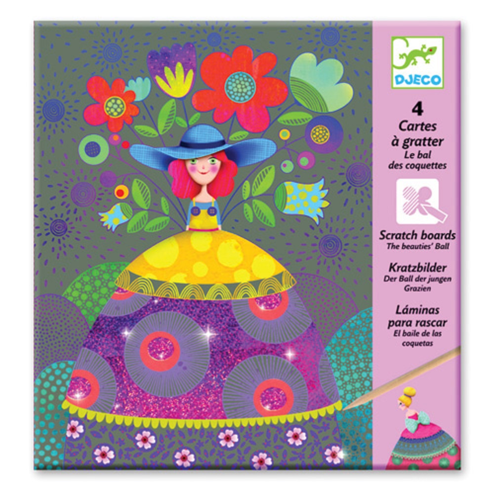 Καρτέλες ζωγραφικής από την εταιρεία Djeco τεχνοτροπίας ‘Scratch’. Χρησιμοποιήστε το ειδικό εργαλείο- ξυλάκι και αποκαλύψτε τις φιγούρες των κοριτσιών με τα πολύχρωμα φορέματα με μεταλλικές λεπτομέρειες. Η συσκευασία περιλαμβάνει τέσσερις καρτέλες με διαστάσεις 21×15 εκατοστά.