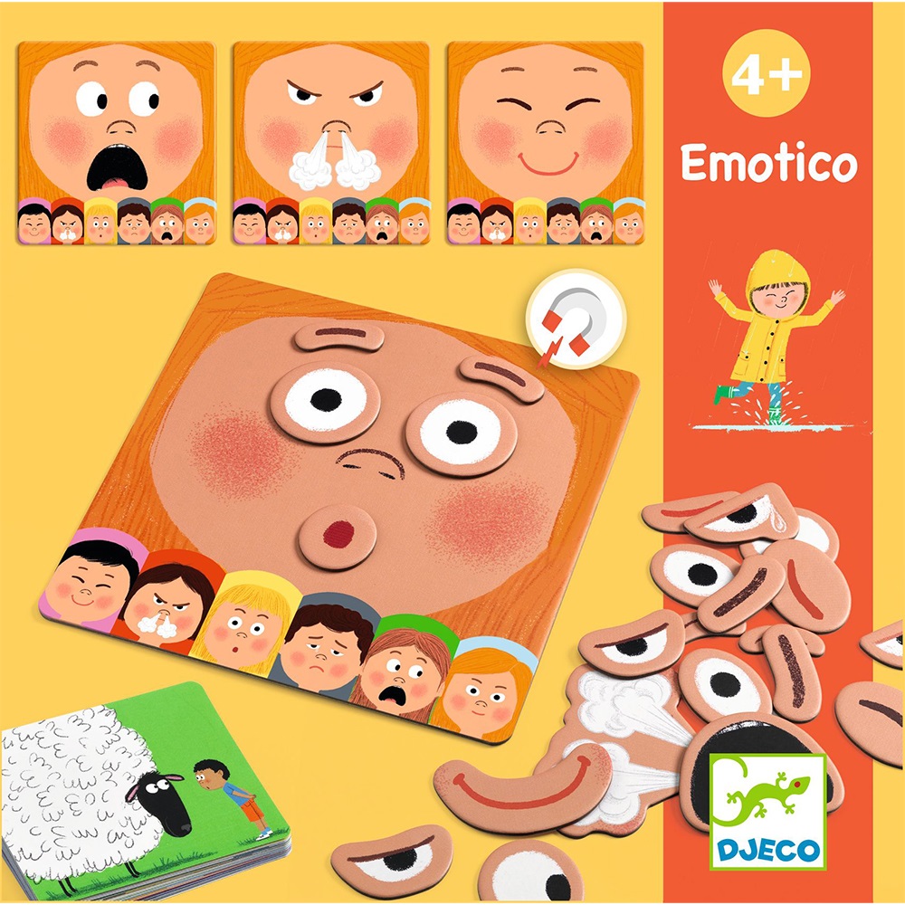 Διαλέξτε μια κάρτα και παρατηρήστε την προσεχτικά: τι νιώθει το αγοράκι ενώ κοιτάει το μεγάλο πρόβατο; Έκπληξη ή φόβο; Τα παιδιά καλούνται να αναγνωρίσουν ποιο είναι το κυρίαρχο συναίσθημα στη σκηνή που απεικονίζεται στη κάρτα ανάμεσα σε χαρά, θυμό, έκπληξη, λύπη, φόβο και ηρεμία. Αφού το αναγνωρίσουν, θα πρέπει να συνθέσουν ένα πρόσωπο που θα καθρεφτίζει αυτό το συναίσθημα, χρησιμοποιώντας μαγνητικά χαρακτηριστικά όπως μάτια, στόμα ή φρύδια. Ένα εκπαιδευτικό επιτραπέζιο της εταιρίας Djeco που καλλιεργεί τη συναισθηματική νοημοσύνη των παιδιών και αναπτύσσει τον προφορικό λόγο τους. Τα παιδιά θα ανακαλύψουν τα διαφορετικά συναισθήματα και τις διακυμάνσεις τους και έτσι θα μάθουν να κατανοούν τα δικά τους συναισθήματα καλύτερα. Το παιχνίδι περιλαμβάνει 1 μαγνητικό ταμπλό, 28 μαγνητικά κομμάτια και 24 κάρτες. Κατάλληλο από 4 ετών και άνω. Διαστάσεις Συσκευασίας: 21.5 x 21.5 x 3 εκ.