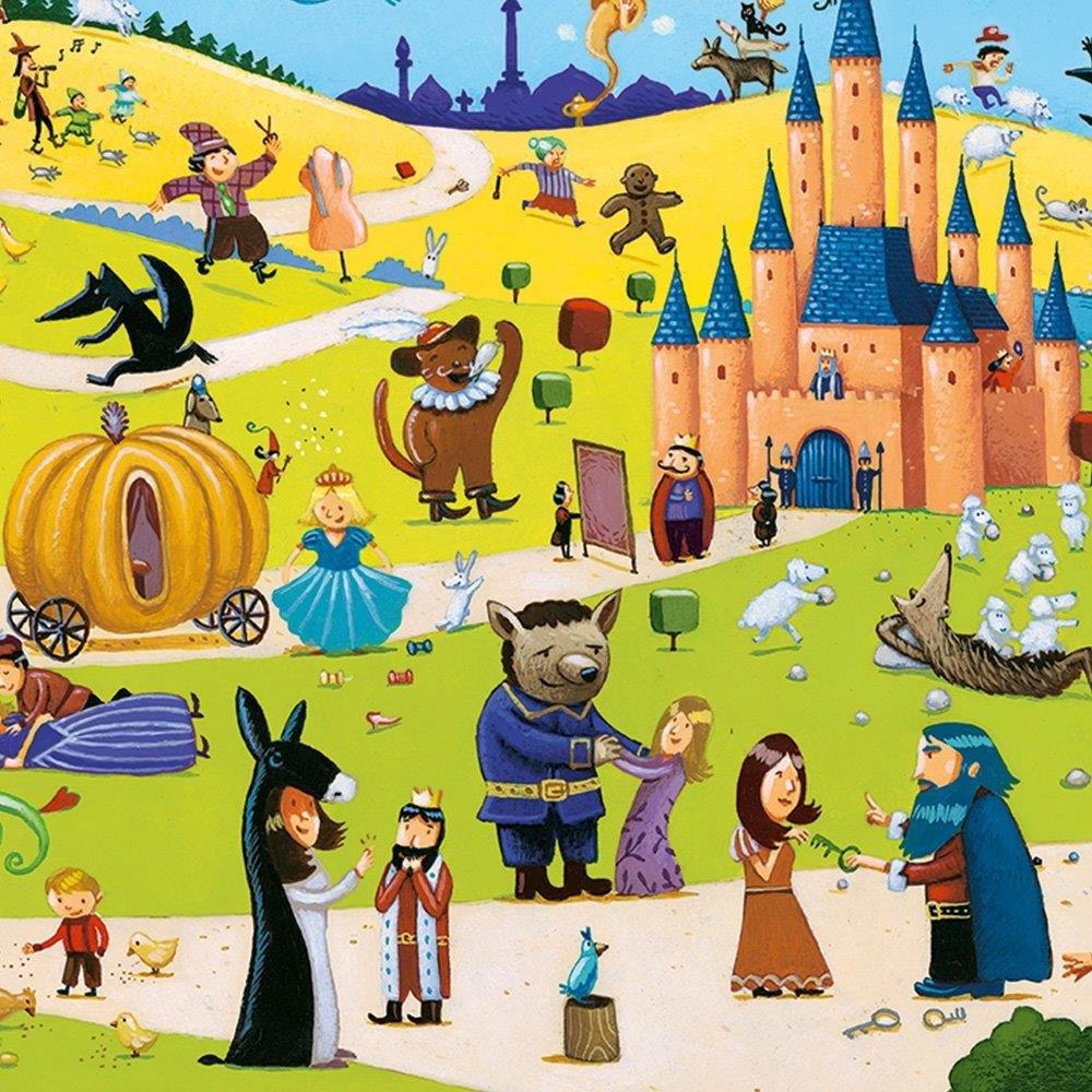 Παραμυθο-συνάντηση κορυφής! Η Κοκκινοσκοφίτσα, ο Παπουτσωμένος Γάτος, ο Αλαντίν, η Σταχτοπούτα, η Ωραία Κοιμωμένη και πολλοί πολλοί ακόμη ήρωες παραμυθιών μαζεμένοι σε ένα μοναδικό παζλ! Το παζλ της εταιρείας DJeco περιλαμβάνει 54 κομμάτια από υψηλής ποιότητας πεπιεσμένο χαρτόνι, καθώς και μια αφίσα με την εικόνα του παζλ. Αφού κατασκευάσετε το παζλ, παρατηρήστε τα αντικείμενα που υπάρχουν περιμετρικά στην εικόνα και προσπαθήστε να τα εντοπίσετε μέσα στο παζλ. Κατάλληλο από 4 χρονών και πάνω. Διαστάσεις: 61×38 cm.