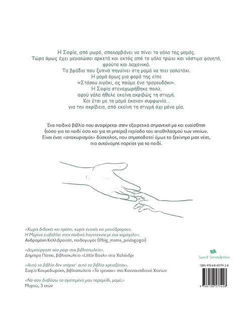 Ένα παιδικό βιβλίο που αναφέρεται στην εξαιρετικά σημαντική μα και ευαίσθητη (τόσο για το παιδί όσο και για τη μητέρα) περίοδο του αποθηλασμού των νηπίων. Είναι ένας«αποχωρισμός» δύσκολος, που σηματοδοτεί όμως το ξεκίνημα μιας νέας, πιο αυτόνομης πορείας για το παιδί.