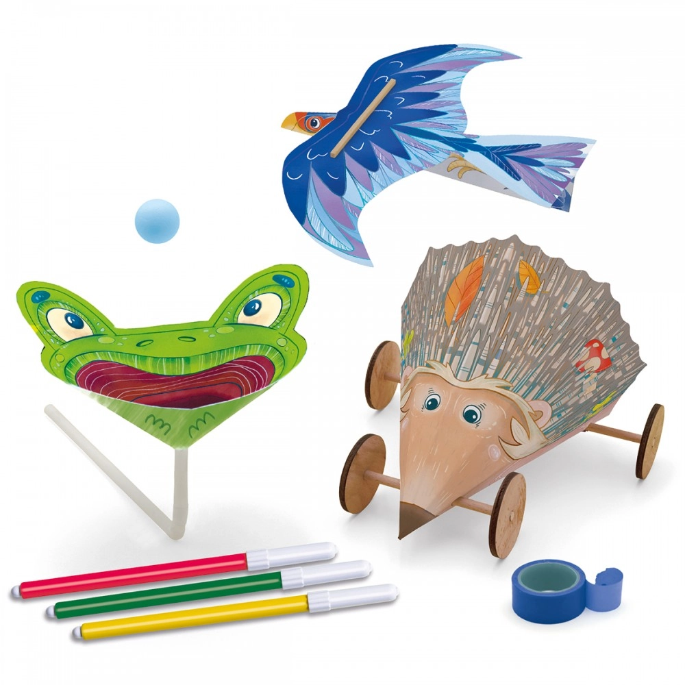 Η νέα, πρωτοποριακή σειρά «Lab & Craft», της αγαπημένης μας Ludattica έχει υλοποιηθεί σε συνεργασία με το μουσείο των παιδιών στη Ρώμη «EXPLORA», ώστε να προωθήσει την εκμάθηση των S.T.E.M. σε παιδιά μικρής ηλικίας, βοηθώντας τα να αναπτύξουν τις απαραίτητες αυτές δεξιότητες μέσω του παιχνιδιού και της διασκέδασης. Με το «Air Machines» τα παιδιά εισάγονται στην έννοια της αεροδυναμικής, φτιάχνοντας κατασκευές που δουλεύουν, εκμεταλλευόμενες τον αέρα. Ο μικρός σκαντζόχοιρος τρέχει σαν τον άνεμο, το χάρτινο χελιδόνι πετά ψηλά στον ουρανό, η μπαλίτσα μένει στον αέρα, πάνω από το στόμα του βατράχου! Ένα μοναδικό παιχνίδι διακόσμησης, χειροτεχνίας και κατασκευής που βοηθά τα παιδιά θα μάθουν τις βασικές αρχές της φυσικής μέσω πειραμάτων. Περιεχόμενα: χαρτόνια για το σκαντζόχοιρο και το βάτραχο, χαρτί για το χελιδόνι, 4 τροχοί, 2 άξονες, 1 ξυλάκι, 5 μαρκαδόροι, 2 χάρτινα καλαμάκια, ταινία, 1 μπάλα, 1 καρούλι κλωστής, εκπαιδευτικό εγχειρίδιο οδηγιών.