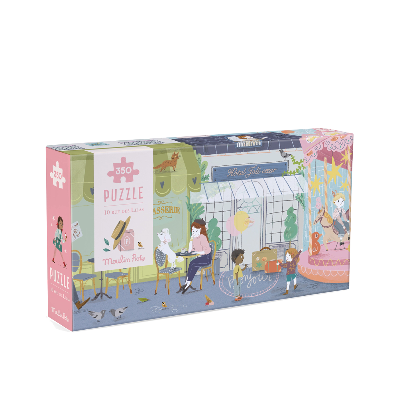 Πανοραμικό παζλ 350 τμχ. 10 rue des Lilas, εικονογραφημένο από την Lucille Michieli + 1 μοντέλο αφίσας. Πολύχρωμες προσόψεις, μικρά τοπικά καταστήματα… οποιαδήποτε στιγμή της ημέρας. Στους Παριζιάνους αρέσει να συναντιούνται σε αυτόν τον όμορφο, ζωντανό δρόμο. 7 ετών και άνω.