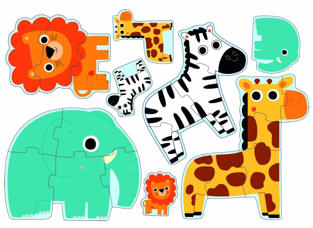 Παζλ των 3, 4, 5 και 6 κομματιών από ανθεκτικό χαρτόνι, για να δημιουργήσεις 4 ζωάκια της ζούγκλας.