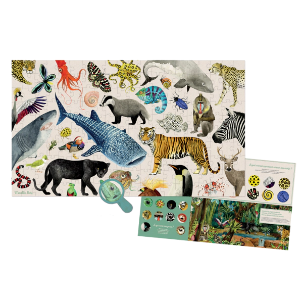 Παζλ παρατήρησης 200 τμχ. Ζώα του κόσμου. Μόλις συναρμολογηθεί αναγνωρίστε σε ποιον ανήκουν αυτά τα μοτίβα, αυτά τα μάτια. Διασκεδάστε βρίσκοντας τα ζώα που κρύβονται στο ντεκόρ της αφίσας χρησιμοποιώντας τον μεγεθυντικό φακό για να σας βοηθήσει. 6 ετών και άνω.