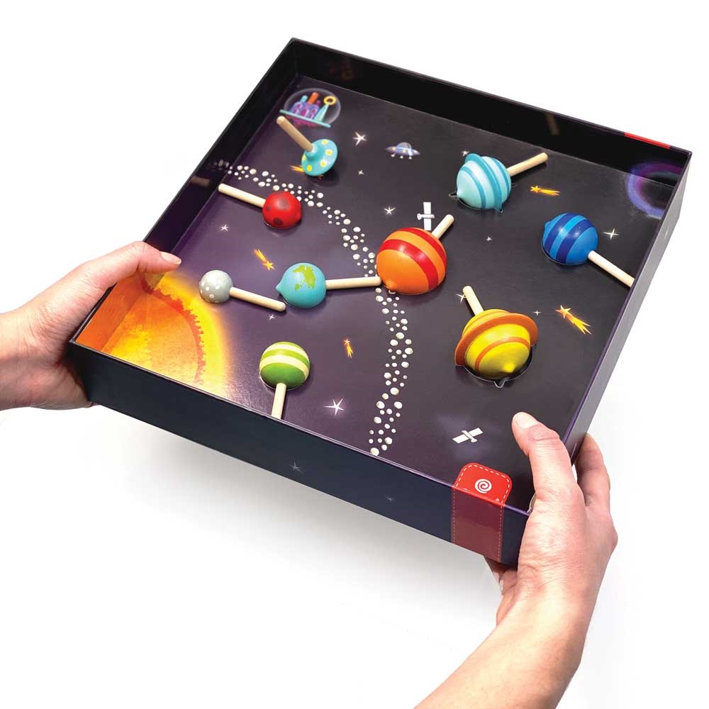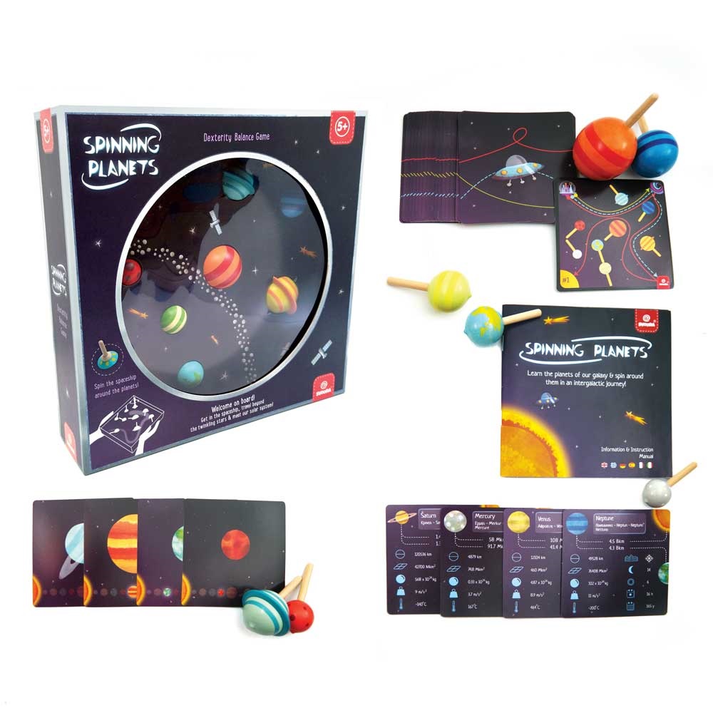 Επιτραπέζιο παιχνίδι με σβούρες για την εκμάθηση του ηλιακού μας συστήματος και την εξάσκηση της λεπτής κινητικότητας. Προσφέρει πολλαπλούς τρόπους παιξίματος και εκπαιδευτικά οφέλη, ανάλογα με την ηλικία των παιδιών. Διαθέτει κάρτες πληροφοριών, οι οποίες όχι μόνο εισάγουν αλλά και εξοικειώνουν τα παιδιά με το πλανητικό μας σύστημα. Παράλληλα, οι 8 σβούρες – πλανήτες σε διαφορετικό μέγεθος και χρώμα η καθεμία, αποτελούν το τέλειο «εργαλείο» εξάσκησης των κινητικών δεξιοτήτων των παιδιών, μέσω της περιστροφής τους. Επιπλέον, το παιχνίδι διαθέτει κάρτες έτοιμων αποστολών με διαδρομές, τις οποίες καλούνται τα παιδιά να διασχίσουν περιστρέφοντας τη σβούρα – διαστημόπλοιο και να φτάσουν τελικά στον προορισμό τους. Με αυτό τον τρόπο βελτιώνουν τη λεπτή κινητικότητα και τη χωρική αντίληψη, αποκτώντας τελικά αυτοπεποίθηση όταν τα καταφέρνουν. Εκτός αυτού, τα παιδιά έχουν τη δυνατότητα να σχεδιάσουν και τις δικές τους αποστολές, αναπτύσσοντας τη δημιουργικότητά τους. Ένα υπέροχο εκπαιδευτικό παιχνίδι, που θα χαρίσει ατέλειωτες ώρες διασκέδασης και δημιουργικής απασχόλησης. Κατάλληλο για ηλικίες από 5 ετών και άνω.