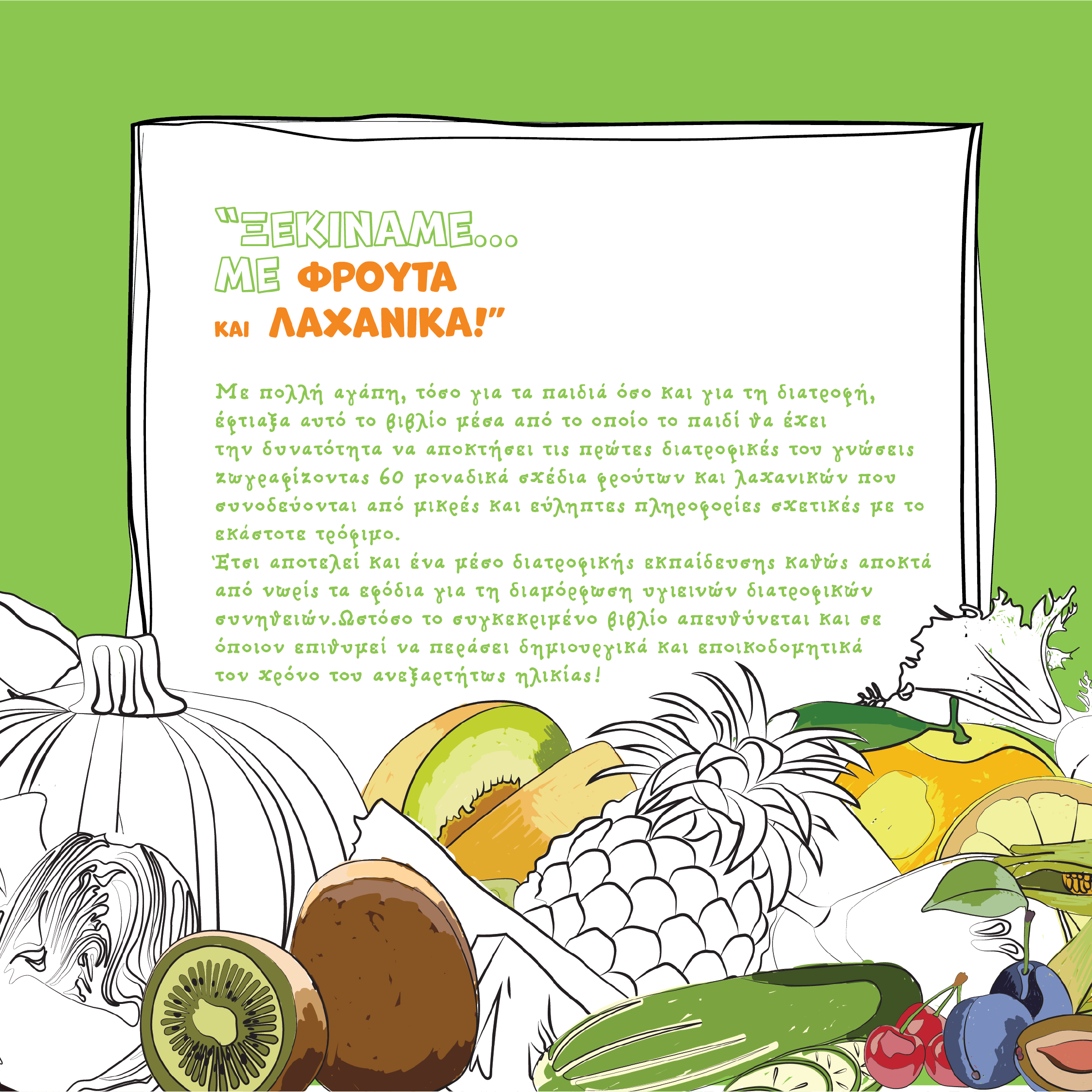 Μέσα από την ενασχόλησή μου με τις διατροφικές συνήθειες των παιδιών διαπίστωσα ότι πολλά απ´ τα παιδιά δυσκολεύονταν στο να αναγνωρίσουν και να διαχωρίσουν τα φρούτα και τα λαχανικά. Αναζητώντας ευχάριστους και διασκεδαστικούς τρόπους εκμάθησης των φρούτων και των λαχανικών σκέφτηκα να συνδυάσω την πληροφορία αυτή με την αγαπημένη τους ενασχόληση, τη ζωγραφική. Με πολλή αγάπη λοιπόν, τόσο για τα παιδιά όσο και για τη διατροφή, έφτιαξα αυτό το βιβλίο μέσα από το οποίο το παιδί θα έχει την δυνατότητα να αποκτήσει τις πρώτες διατροφικές του γνώσεις ζωγραφίζοντας 60 μοναδικά σχέδια φρούτων και λαχανικών που συνοδεύονται από μικρές και εύληπτες πληροφορίες σχετικές με το εκάστοτε τρόφιμο. Έτσι αποτελεί και ένα μέσο διατροφικής εκπαίδευσης καθώς αποκτά από νωρίς τα εφόδια για τη διαμόρφωση υγιεινών διατροφικών συνηθειών. Ωστόσο το συγκεκριμένο βιβλίο απευθύνεται και σε όποιον επιθυμεί να περάσει δημιουργικά και εποικοδομητικά τον χρόνο του ανεξαρτήτως ηλικίας!